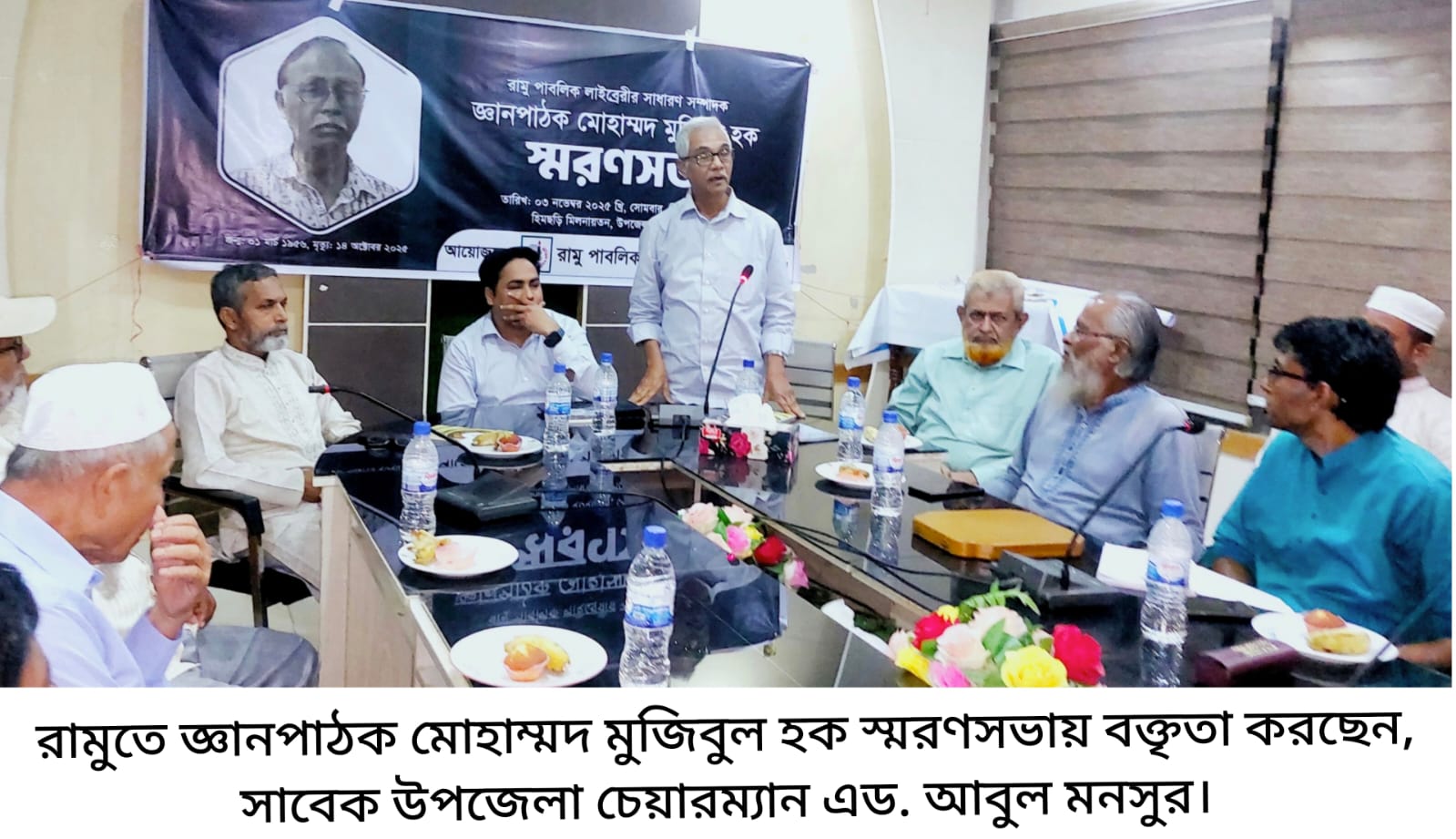 খালেদ শহীদ: রামু সরকারি কলেজের অবসরপ্রাপ্ত শিক্ষক ও রামু পাবলিক লাইব্রেরীর সাধারণ সম্পাদক মোহাম্মদ মুজিবুল হক স্মরণে স্মরণসভা অনুষ্ঠিত হয়েছে। সোমবার (৩ নভেম্বর) বিকালে রামু উপজেলা পরিষদের হিমছড়ি কনফারেন্স রুমে এই স্মরণসভার আয়োজন করা হয়। এতে জ্ঞানপাঠক মোহাম্মদ মুজিবুল হকের দীর্ঘ কর্মময় জীবন, সামাজিক, সাংস্কৃতিক ও শিক্ষাক্ষেত্রে অসামান্য অবদান এবং ব্যক্তিগত স্মৃতিচারণ করেন কলেজের সহকর্মী শিক্ষক, শিক্ষার্থী, গুণগ্রাহীরা সহ পরিবারের সদস্যরা।